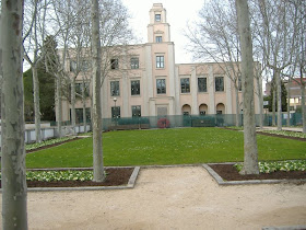 Vista desde dento del edificio, al fondo la puerta del Jardín Botánico (las líneas amarillas son simplemente el reflejo del cristal, no es que haya tirolinas por el Paseo del Prado )