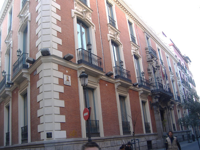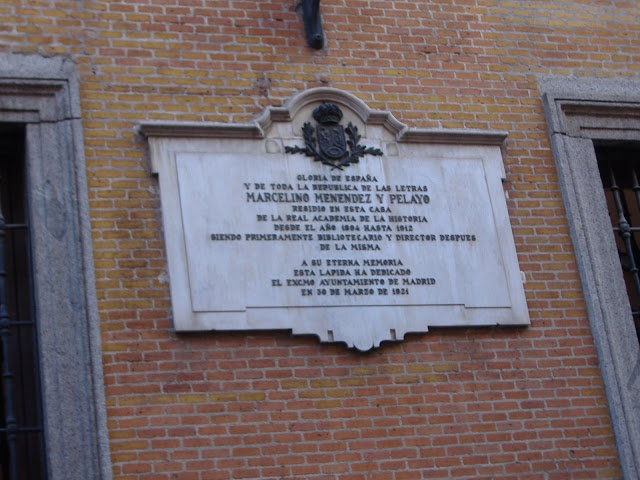 Placa a la memoria de D. Marcelino Menéndez y Pelayo, en la fachada de la Real Academia de la Historia, donde residió. Fue bibliotecario y director de la misma.