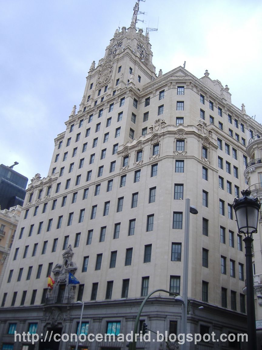Gran Vía, 28 Edificio de la Compañía Telefónica Nacional de España. Situado en el segundo tramo, fue construido entre 1926 y 1929 por el arquitecto Ignacio Cárdenas Pastor, para sede de la Compañía Telefónica Nacional de España. Entre 1951 y 1955 el edificio fue ampliado.