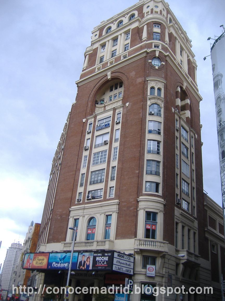 Plaza de Callao, 4 Palacio de la Prensa fue construido entre 1925 y 1929 por el arquitecto Pedro Muguruza Otaño, para sede social de la Asociación de la Prensa de Madrid. La primera piedra la puso Alfonso XIII en 1925 y el 2 de enero de 1929 se inauguraba con la proyección de la pelicula "El destino de la carne". El coste total del edificio fue de ocho millones de pesetas.