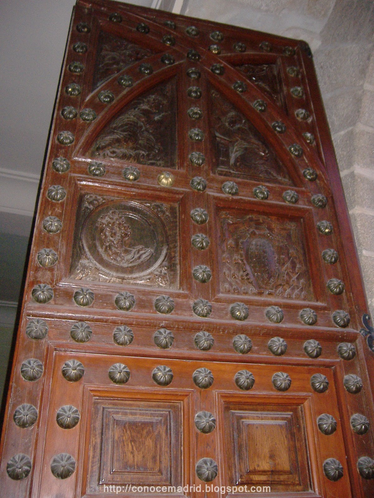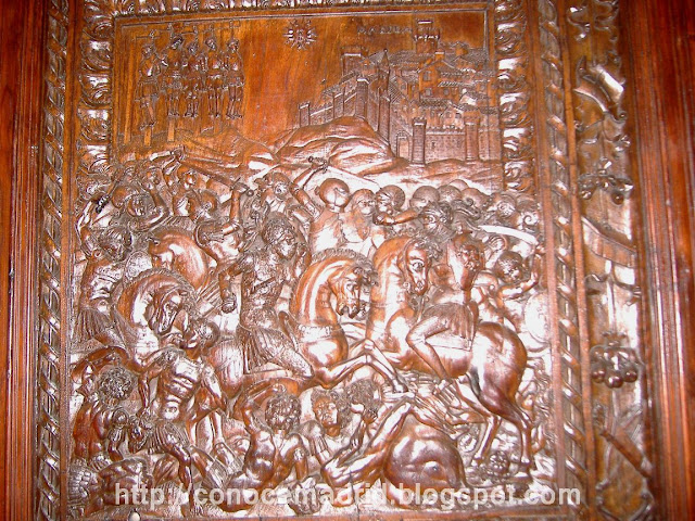 Detalle de la puerta interior, labrada en madera de nogal, una obra maestra del arte renacentista, con diversas escenas principalmente del Antiguo Testamento.