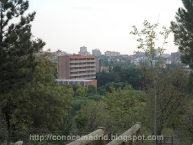 Vista desde el Cerro de las Balas o de los Locos, del Colegio Mayor Teológico Hispano-Americano de Santiago y Capilla, que actualmente es el Colegio Mayor Santo Tomas de Aquino. La parte baja del edificio se utiliza como aula de dibujo de la Escuela de Arquitectura del CEU. El edificio fue construido por el arquitecto Gregorio del Amo.
