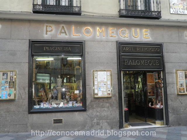 Palomeque, en la calle Arenal, 17. Dedicada a la venta de artículos religiosos, su fundación consta en la fachada: el día 8 de diciembre de 1873. En su interior, en la parte alta de las vitrinas, aparece una inscripción con el nombre del fundador, Manuel Palomeque Delafont y el título honorífico de proveedor de “Reales Casas y del Papa”. Estuvo mucho tiempo en manos de la familia Palomeque hasta que pasa a la familia Rueda, que es la que continúa con el negocio.