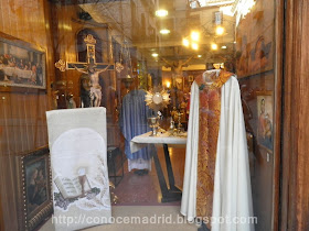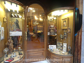 En la tienda destacan los armarios y vitrinas de madera decorados con arcos apuntados y tracerías doradas, y las pinturas de santos en el dintel que da paso a la trastienda.