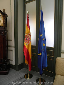 Sala de Banderas. Toda la Nación española se encuentra representada en la llamada Sala de Banderas, en la que se encuentran las banderas de España, la Unión Europea, las 17 comunidades autónomas y las ciudades autónomas de Ceuta y Melilla. La luz natural, procede de una inmensa vidriera cenital de la que cuelga una lámpara de la época.