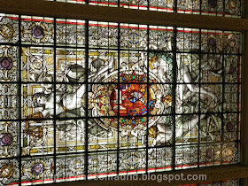 Cristalera de estilo modernista. El motivo central es la diosa griega Themis, que aporta la balanza y la espada.