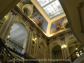 Escalera de Honor. De carácter monumental y principesco, desciende bajo los frescos del techo, pintados por Enrique Simonet con motivos referentes a las regiones de España, y desemboca en un vestíbulo presidido por dos estatuas de Coullant Valera que representan a Alfonso X y a Justiniano.