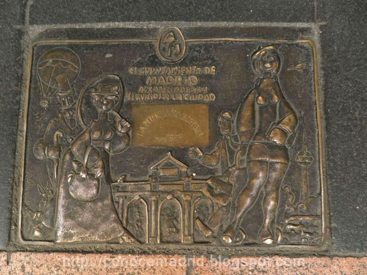 El Ayuntamiento instala una placa de bronce en la vía publica, según diseño de Antonio Mingote, en la que se recoge el nombre del establecimiento, el año en que abrió, y la siguiente mención: "El Ayuntamiento de Madrid agradecido por los servicios a la Ciudad".