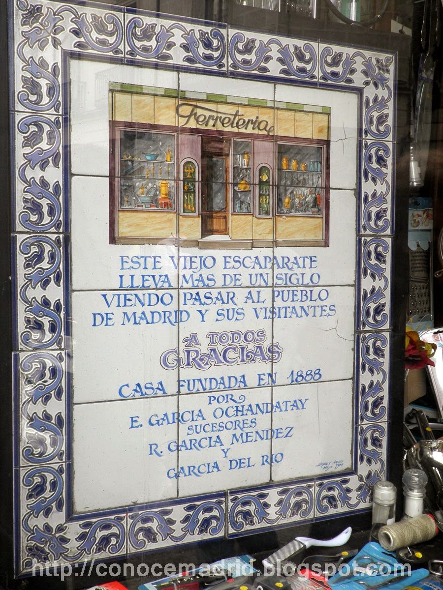 La ferretería se instala en 1888 sobre un antiguo convento y se hace famosa en Madrid por sus artículos novedosos procedentes de Alemania e Inglaterra. De carácter familiar, llega a tener cinco empleados, además del dueño, Esteban García Ochandatay, que vino a la capital desde un pueblito de Logroño buscando una forma de vida diferente. La tienda no ha cambiado con el tiempo, perdurando el mostrador de madera, en forma de “U”, flanqueado en su parte central por dos columnas, como en muchas tiendas de fines del XIX, y con su caja registradora “National” a un lado. Las bisnietas de Esteban, Ángela y María Jesús, han permanecido al pie del mostrador, sorteando peores tiempos. Calle Atocha, 57.