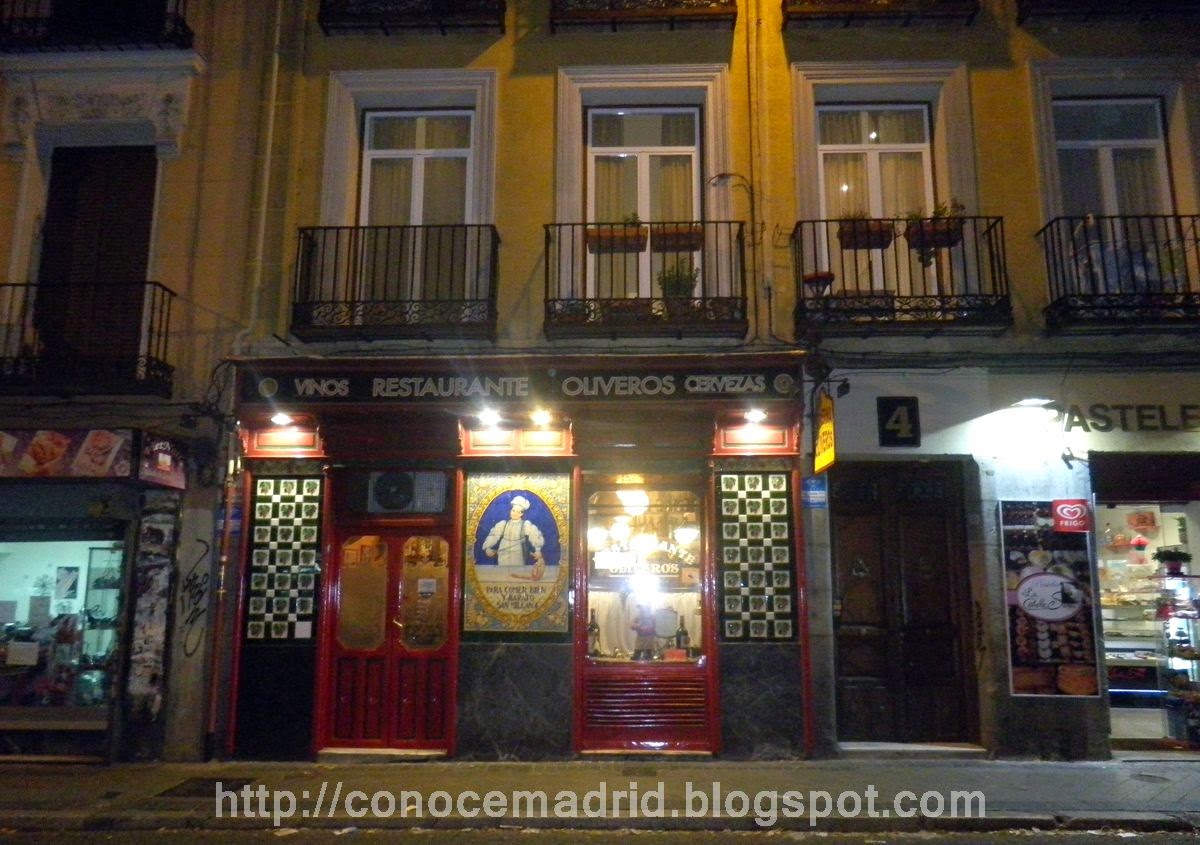 Calle de San Millán, 4 Restaurante Taberna Oliveros El Restaurante Oliveros se fundó en el año 1857 por una familia de asturianos y fue adquirido por la familia Oliveros en 1920. Durante mucho tiempo fue el lugar tradicional de reunion de los asentadores de pescado. Su cocina es tradicional madrileña con influencia asturiana. El plato estrella es la "Tzabaza", una mezcla de callos, garbanzos y fabes, y su postre más famoso son los "Paponzuelos", a base de bizcocho, de nata, de crema pastelera y azúcar quemado. La portada de azulejos es del año 1922 y ha sido portada de varios libros. El eslogan reza: "Para comer bien y barato San Millán 4". Este restaurante se ubica en el Madrid castizo, cerca de la Plaza de Tirso de Molina y de la Latina, zona muy bien comunicada.