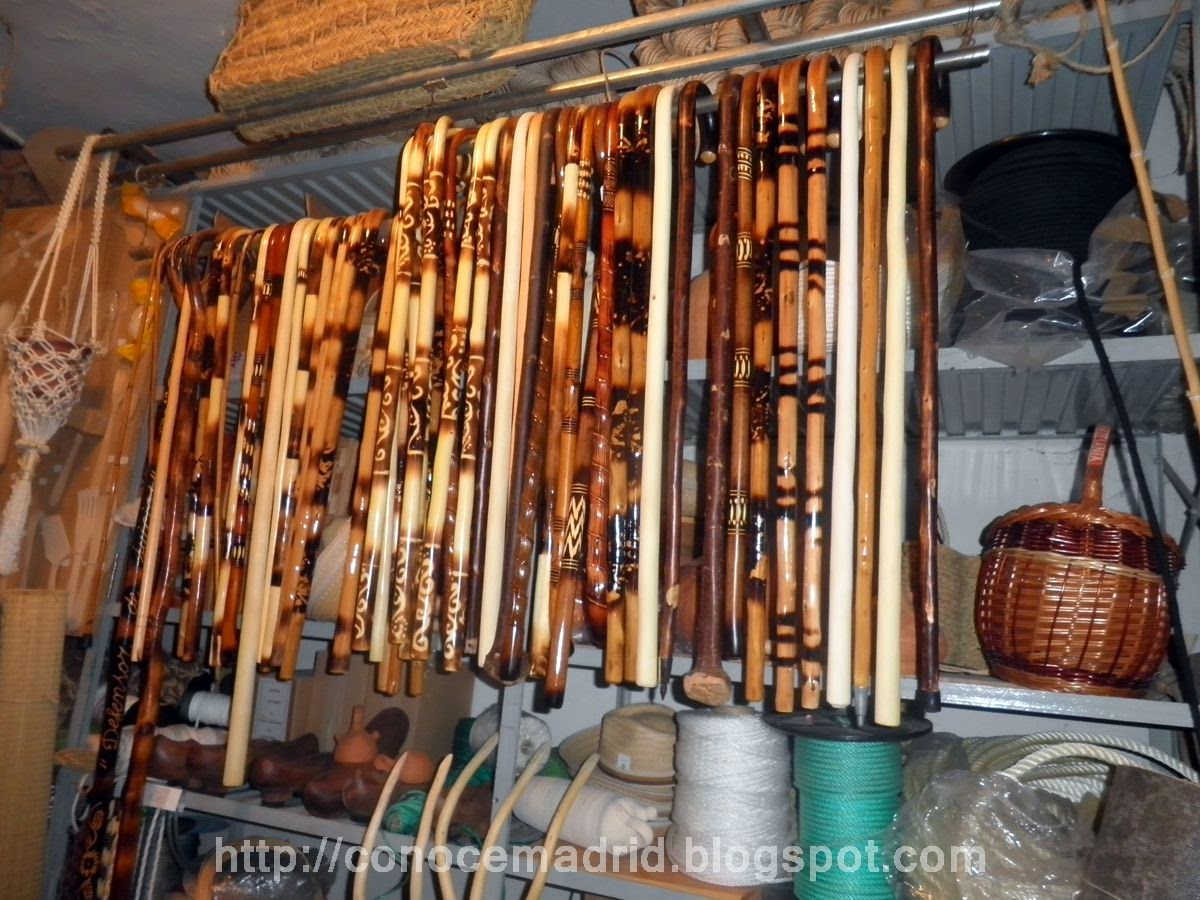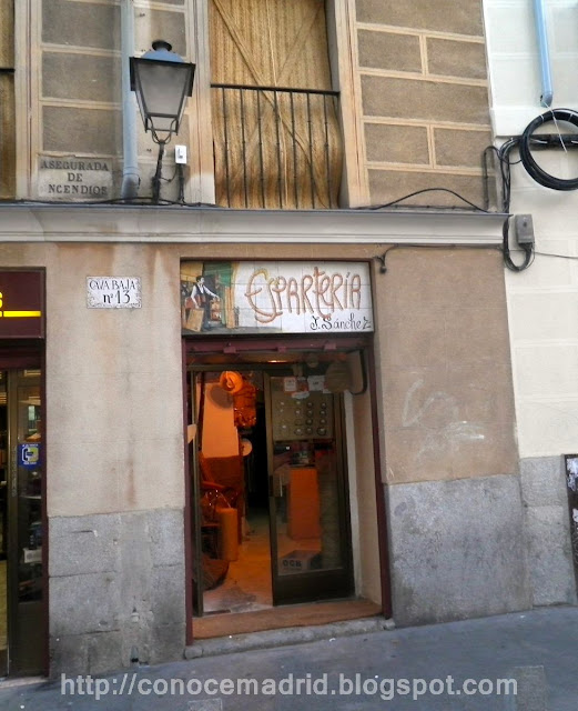 Calle Cava Baja, 13 Espartería Juan Sánchez. Es de las pocas tiendas que quedan de artesanía en Madrid, es una tienda de decoración, de productos típicos, de manualidades, de antigüedades, de disfraces, una tienda de barrio, cordelería, cestería, cacharrería, sillería… Venden productos rurales como botijos o botas de vino, pero también palos de kali para artes marciales, cuerdas para bomberos, huchas de cerdito, trampas para ratones…