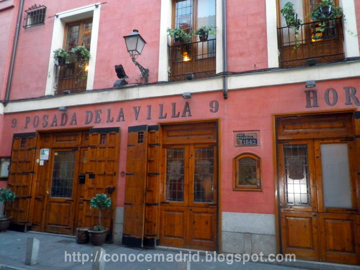 Calle Cava Baja, 9 La Posada de la Villa data de 1642. En los alrededores de la Plaza Mayor, Cavas y calle Toledo existieron gran cantidad de lugares de hospedaje, ya que era zona de paso de los coches y diligencias que traían a Madrid a comerciantes, trabajadores y visitantes. Situada en lo que anteriormente fue el único molino de harina existente en Madrid, la Posada de la Villa era un lugar más de alojamiento y comidas de la época. Cuando las casas de hospedaje de la zona decayeron la Posada no fue una excepción. Muchas de estas casas: La Posada del Dragón o la del León por ejemplo no han sobrevivido, pero la Posada de la Villa, ya en estado calamitoso, fue restaurada por Félix Colomo en 1981. Se transformó en el horno de asar actual, especializado en cocina tradicional, como su cocido madrileño hecho en puchero de barro sobre las cenizas de paja y troncos de encina, o el cordero lechal asado en cazuela de barro en el antiguo horno árabe.